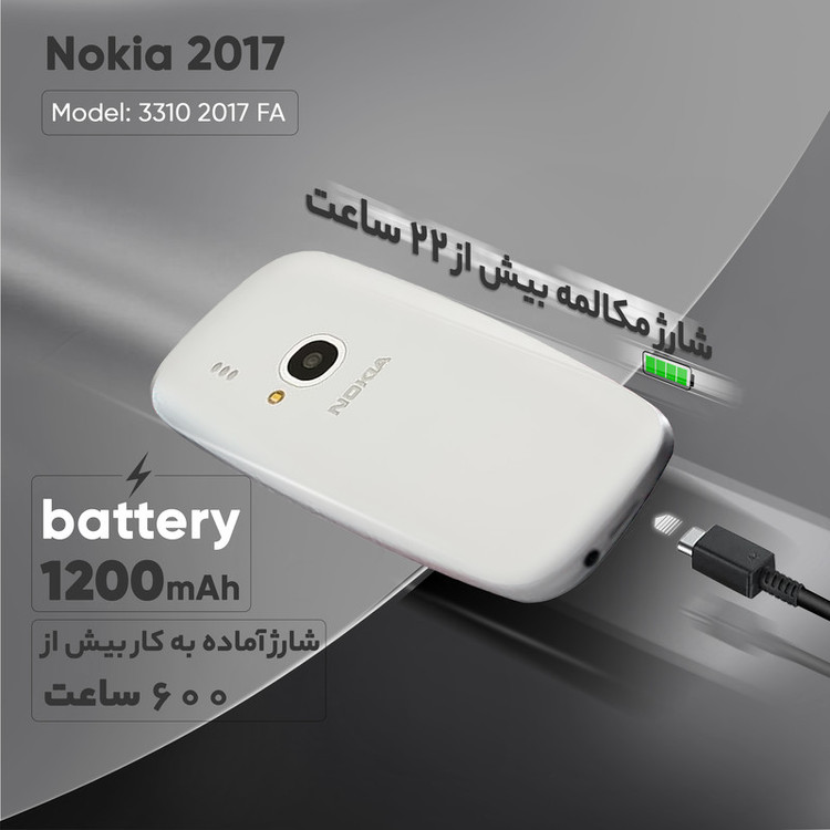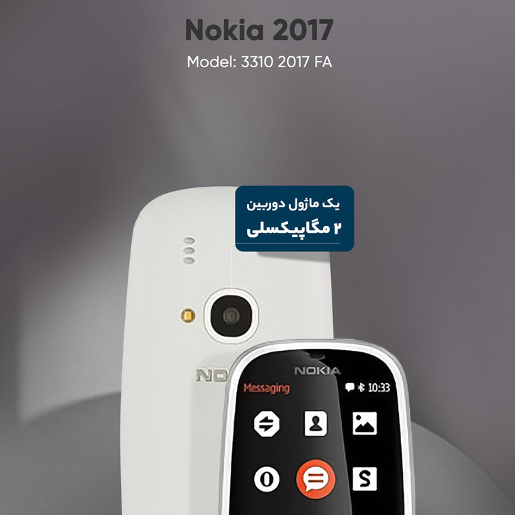 «نوکیا» تولیدکنندهی گوشیهای موبایل کلاسیک قدیمی، بهتازگی محصول جدیدی را با عنوان «3310 نسخهی 2017 دو سیمکارت» (3310 (2017) Dual SIM) تولید کرده است و بهزودی در اختیار کاربران قرار خواهد داد. نوکیا در طراحی ویژهی 3310 صفحهکلیدی قرار داده که تایپ و ارسال پیامک بهوسیله آن بسیار آسان خواهد بود؛ همچنین این محصول از دو سیمکارت پشتیبانی میکند و حدود 79 گرم وزن دارد. نوکیا 3310 را به نمایشگری 2.4اینچی مجهز کرده که از نوع LCD بوده و در ساخت آن از فناوری TFT بهره گرفته شده است. این نمایشگر قابلیت نمایش 256 هزار رنگ را دارد و میتواند با توجه به ابعادش تراکم پیکسلی 167 پیکسل بر هر اینچ را به تصویر بکشد. همانطورکه اشاره شد، شما بهعنوان کاربر میتوانید دو سیمکارت در سایز مایکرو را درون شیارهای 3310 قرار دهید و از آن برای برقراری ارتباط استفاده کنید. بد نیست بدانید این دو سیمکارت تنها از شبکهی G2 پشتیبانی میکنند و به شبکههای دیگر اینترنت دسترسی ندارند. از دیگر راههای ارتباطی در محصول جدید نوکیا میتوانیم به EDGE، بلوتوث نسخهی 3.0 و رادیو FM اشاره کنیم. مانند بسیاری از محصولات کلاسیک، در 3310 هم خبری از دوربین سلفی نیست و روی قاب پشتی آن سنسوری دو مگاپیکسل نقش دوربین اصلی را ایفا میکند. این دوربین به فلشی از نوع LED مجهز شده و قابلیت فیلمبرداری هم دارد. وظیفهی تامین انرژی این مجموعهی امکانات 3310، به باتری لیتیومیونی با ظرفیت 1200 میلیآمپر ساعت سپرده شده که با یکبار شارژ کامل میتواند امکان 22 ساعت مکالمه را برای کاربران فراهم کند. لازم به ذکر است که این گوشی به کیبورد با زبان فارسی مجهز شده است.