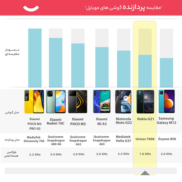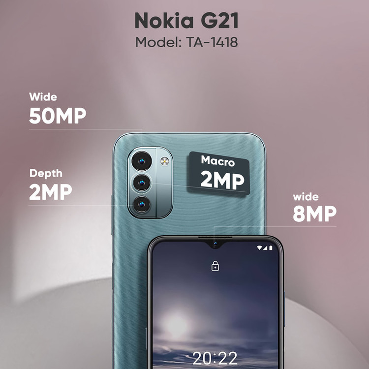 نوکیا G21 یکی از گوشیهای هوشمند میانرده و مقرون بهصرفه شرکت نوکیا است که با توجه به قیمت در نظر گرفته شده، از مشخصات فنی مناسب و قابل قبولی بهره برده است. در نمای روبهرویی صفحهنمایش یکدست و زیبایی با ابعاد 6.5 اینچ و رزولوشن 720×1600 پیکسل از نوع IPS LCD را شاهد هستیم که به لطف بهره بردن از نرخ بروزرسانی 90 هرتز و تراکم پیکسل 270ppi، توانایی ارائه عملکرد خوب و کاملا قابل قبولی را دارد. در قسمت پشتی هم یک سنسور دروبین اصلی با رزولوشن 50 مگاپیکسل در کنار دو سنسور با رزولوشن 2 مگاپیکسل از نوع سنجش عمق و ماکرو، سنسورهای دوربین سهگانه این گوشی میانرده را تشکیل میدهند. بریدگی قطرهای شکل ناچ در قسمت بالایی و مرکزی صفحهنمایش هم سنسور دوربین سلفی با رزولوشن 8 مگاپیکسل را در خود جای داده است. پردازنده میانرده Unisoc T606 هم این گوشی را همراهی میکند که سبب شده نوکیا G21 توانایی ارائه عملکرد مناسبی در اجرای نرمافزارهای محبوب و بازیهای نهچندان سنگین داشته باشد. اما یکی از معیارها برای خرید یک گوشی میانرده، بهره بردن از باتری قدرتمند است. نوکیا G21 هم از باتری قدرتمندی با میزان ظرفیت 5050 میلیآمپرساعت بهره برده که به ازای هر بار شارژ صد درصدی، طول عمر مفید (زمان آماده بهکار) بسیار خوب و قابل قبولی را ارائه میکند. قابلیت امنیتی و بسیار پرکاربرد حسگر اثر انگشت هم در قسمت کناری روی دکمه پاور قرار گرفته است.