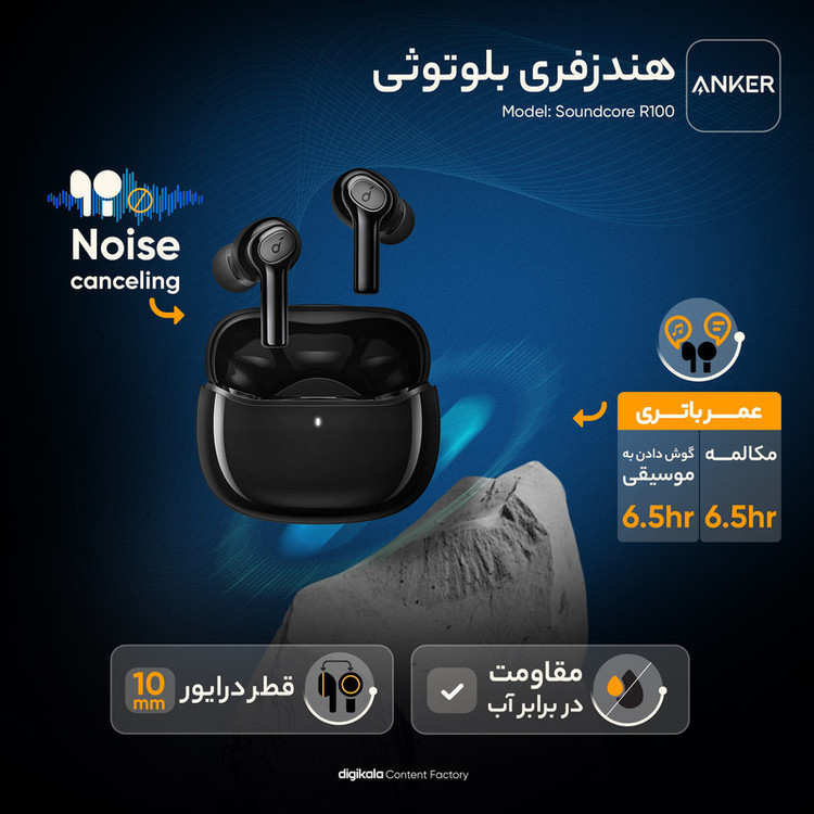 هدفون بلوتوثی اَنکر Soundcore R100 با داشتن دو میکروفون داخلی با فناوری نویز کنسلینگ، امکان برقراری تماسهای تلفنی شفاف و واضح را برای شما فراهم خواهد کرد. Anker R100 با گوشیهای ارگونومیکی که دارد و قابلیت تنظیم سایز سریها با اندازه گوش، به خوبی درون گوش فیکس میشود تا حین دویدن و واکنش سریع بدن سقوط نکند. همچنین این هدفونهای بیسیم با داشتن گواهی استاندارد IPX5، ضدآب هستند و درصورت تعریق هنگام ورزش یا تماس با رطوبت و گرد و غبار، مقاومت خوبی نشان میدهند. فناوری بلوتوث نسخه 5.0 این هدفونها تا شعاع 10 متری اتصال خود را با گوشی موبایل، تبلت یا دیگر دستگاههای هوشمند موردنظرتان حفظ خواهد کرد. این محصول میتواند با دستگاههایی که سیستم عامل Android 5.0 یا بالاتر را دارند جفت شود. همچنین اگر از کاربران اپل هستید نگران نباشید، این هندزفری بلوتوثی با سیستم عامل iOS 10 یا بالاتر هم کاملا سازگار است و مجموعهای از پروتکلهای A2DP ، AVRCP ، HFP را پشتیبانی میکند. این هدفون به لطف درایور 10 میلیمتری و تکنولوژی BassUp میتواند صدایی با کیفیت و باس بالا برای شما پخش کند تا نهایت لذت را از شنیدن موسیقی ببرید. کیس شارژ هندزفری بلوتوث انکر Soundcore R100 به یک باتری لیتیوم پلیمری با قابلیت شارژ سریع مجهز شده است. شارژ آن از طریق پورت USB Type-C انجام میشود که حدود 2 ساعت طول خواهد کشید؛ این باتری قادر است انرژی مورد نیاز برای پخش موزیک تا 6.5 ساعت را برای ایرپادها فراهم کند. همچنین باکس شارژ میتواند تا 25 ساعت شما را بدون نیاز به شارژ نگه دارد. گفتنی است ایرپادها هم از قابلیت شارژ سریع پشتیبانی برخوردارند و با تنها 10 دقیقه شارژ، میتوانید 1 ساعت از آنها استفاده کنید.