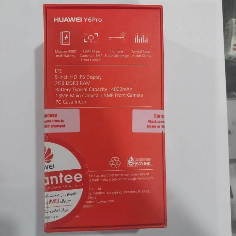 مشخصات کلی گوشی گوشی هوآوی Y6 Pro 4G | حافظه 16 رم 2 گیگابایت تعداد سیمکارت: دو سیم کارت قطع سیم کارت: ميکرو وزن : 160 گرم پردازنده: Mediatek MT6735P Chipset حافظه داخلی: 16 گیگابایت رم : 2 گیگابایت حافظه جانبی: پشتیبانی از حافظهی microSD تا 256 گیگابایت سایز صفحه نمایش: 5 اینچ رزولوشن صفحه نمایش: 1280 × 720 | HD ارتباطات: پشتیبانی از شبکه 2G ، 3G ، 4G مجهز به: GPRS، EDGE، Wi-Fi، بلوتوث، راديو دوربین: 13 مگاپيکسل امکانات دوربین: فوکوس لمسی - تشخیص لبخند - HDR- پاناروما و... دوربین سلفی: 5 مگاپیکسل صدا: اسپیکر دارد - جک 3.5 میلیمتری امکانات نرم افزاری: سیستم عامل Android Lollipop 5.1 - پشتیبانی از زبان فارسی باتری: لیتیوم-یون 4000 میلیآمپر بر ساعت اقلام همراه: دفترچه راهنما، کابل USB، قاب ژلهاي، شارژر، هندزفري